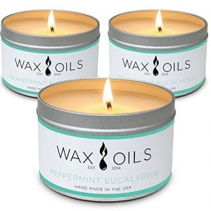 Wax and Oils Peppermint Eucalyptus Candles come in a three pack and are available in several different scents and moods. The candles are infused with essential oils of Cedarwood, Peppermint, Eucalyptus and Patchouli. Absolutely no dyes are used in the candle.