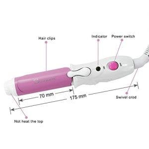 Oumers mini curling iron is dual voltage, with a range of 110-220 Volts – you’ll need a travel adaptor. Its comes in purple, pink and baby blue. It features a tangle free swivel cord and the diameter is approximately 1 inch and its 6.8 inches long. The brand Oumer specializes in good customer service and high quality products.