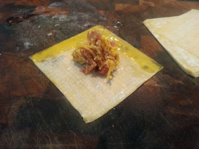 Now stuff the wonton. Oops this is a photo of some sausage filling but just close your eyes and imagine the cream cheese crab filling! Now don’t overfill but put just about a teaspoon of filling right in the middle