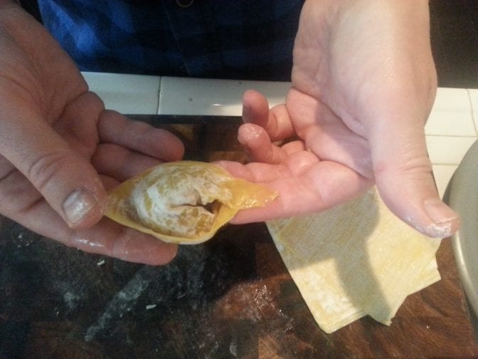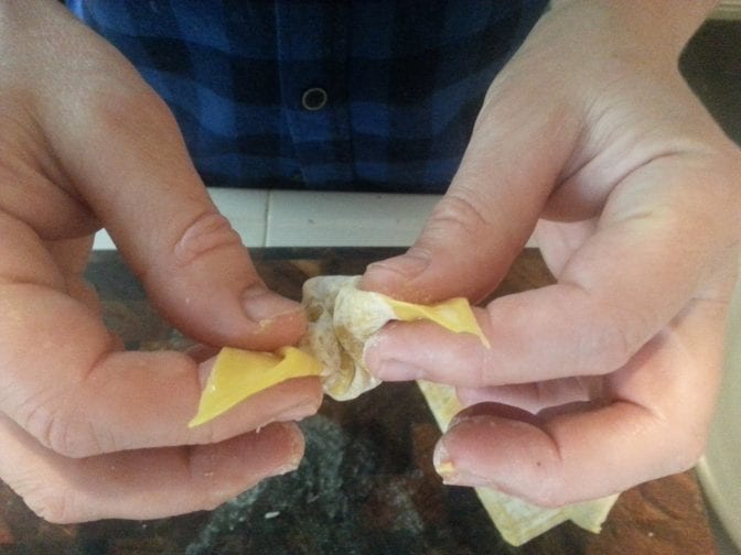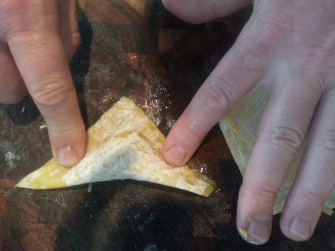 Now hold the wonton with the edges that are farthest from each other, as if it were an upside down triangle and bring those edges together with their opposite ends touching. Don’t worry I messed up a couple of wontons before I got it down