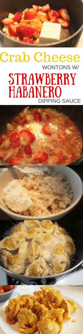 After the wontons are nice and golden, add Strawberries, Habanero and Butter, bring to a boil. Dont get rid of the habanero seeds – you want the spicy kick that the seeds will add! While the sauce is on the stove, you can start working on the crab cheese filling.
