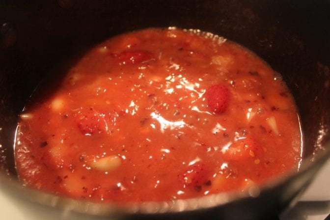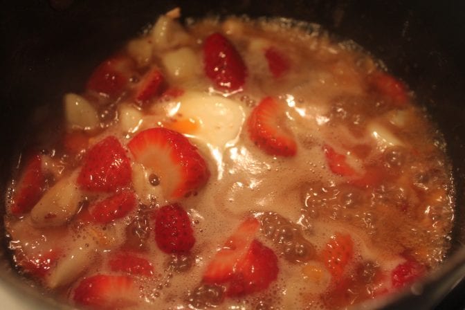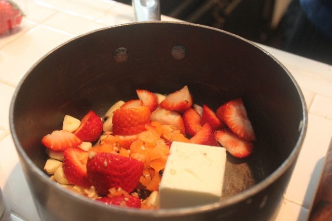 Ok lets start with the Strawberry Habanero Dipping Sauce! I didnt picture it here, but make sure that you heat the olive oil and saute the garlic until soft first before adding the strawberries and all the other ingredients. The garlic takes longer to cook!