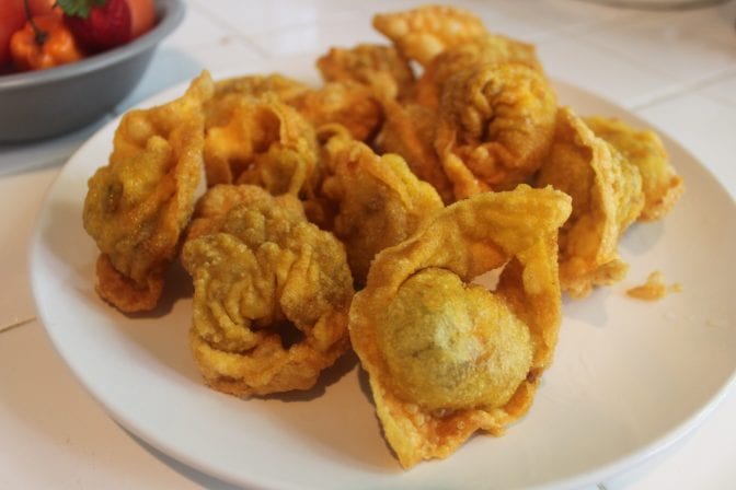5. In a wok heat two inches of oil until it reached 375 degrees. Fry wontons until golden brown, about 1-2 minutes 6. Place finished Wontons on a paper towel to drain