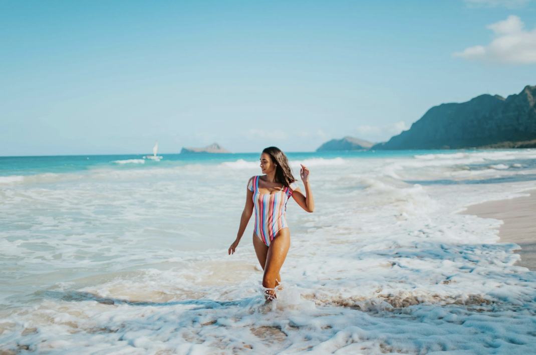 Two-piece swimsuits (AKA ‘bikinis’) reveal more skin and can help you get more of a tan. Bikini bottoms are often easier to slip on and off, which can be useful when using the bathroom. Bikini tops can meanwhile be fitted like bras to provide maximum comfort. Two-piece swimsuits come in many styles, and you can mix and match them to create your own unique look. Some people may also find them less restrictive than one-pieces.