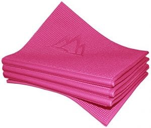 Gaiam’s Foldable Yoga Mat is a scored yoga mat featuring a unique stick texture that will keep you from slipping and sliding while in your downward dog. The mat measures 2mm thick and when all folded up it measures 10 inches by 12 inches.